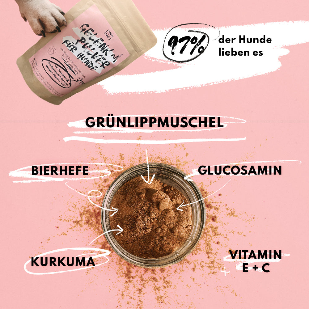 Wir empfehlen unser people who kaer Gelenkpulver zur Unterstützung der Gelenke deines Hundes, welches wir mit Tierärzten und Ernährungsexperten entwickelt haben.