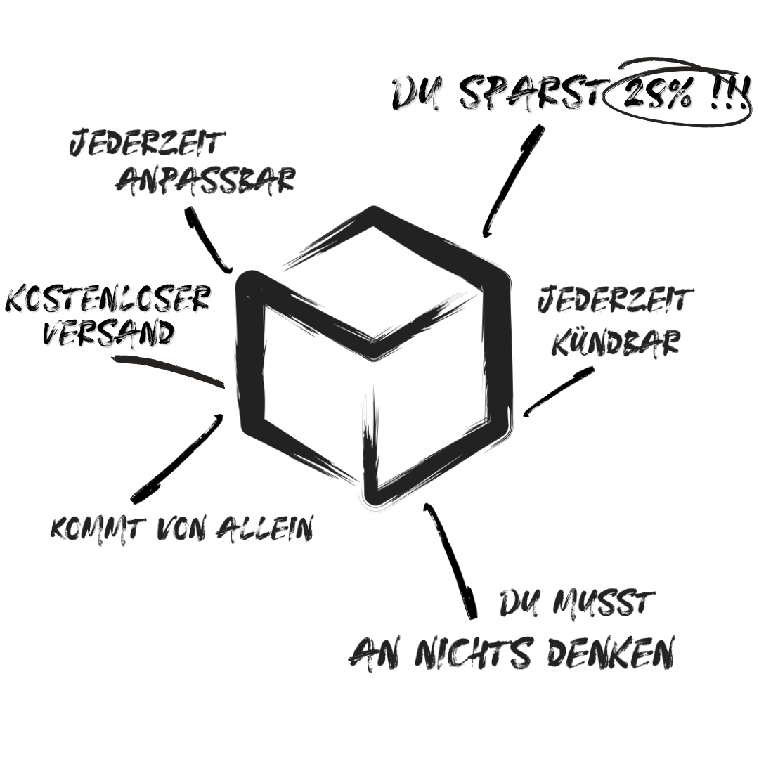 Dadurch dass du jederzeit kündigen kannst und wir gar keine Lust auf nervige Mindestlaufzeiten haben, lohnt sich es ab der ersten Bestellung die regelmäßige Lieferung zu wählen.
